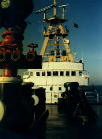 Hier stehe ich mit dem Rücken im Fahrtwind hoch oben auf dem blanken Deck